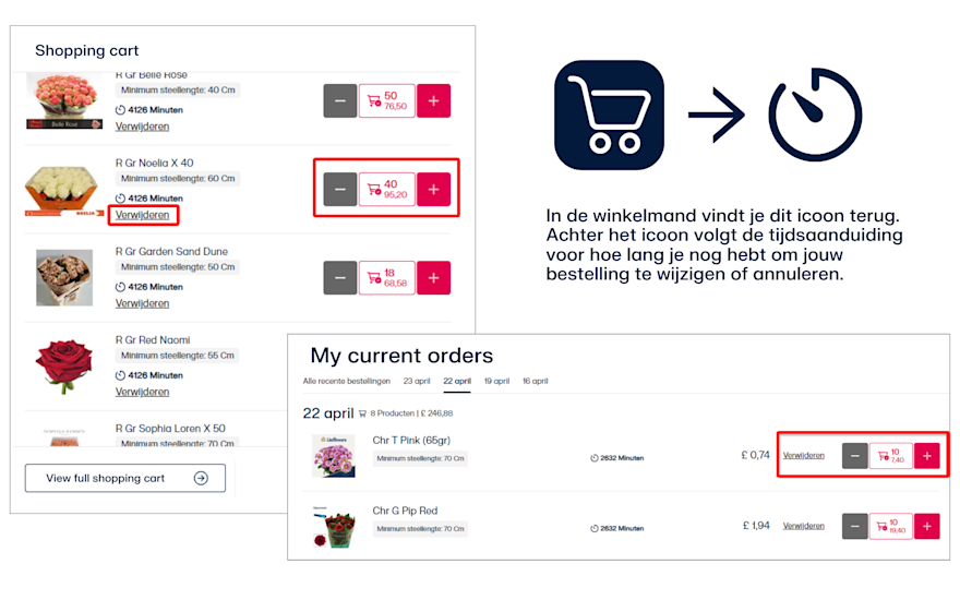 Aanpassingen aan je bestelling kun je gemakkelijk maken via de minicart of bij 'Mijn lopende bestellingen'. Let op: je hebt tot vijf minuten om bepaalde artikelen te wijzigen. Dit zal ook aangegeven worden met een tijdsaanduiding.Vers van de kweker