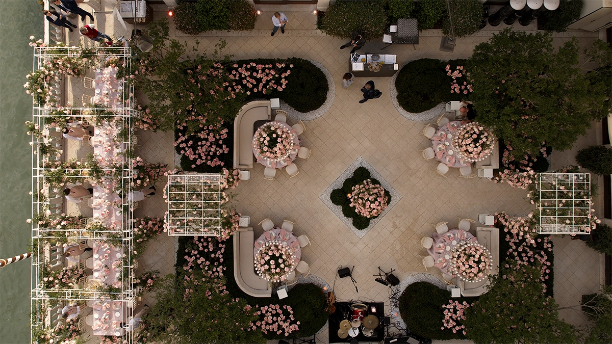 I bryllupstemaet Soft Bloom står én blomst i sentrum: Esperance rosen. Med sine myke rosatoner og kremfargede kjerne danner den grunnlaget for det florale uttrykket. Sammen med rosa tekstiler, hengende lysekroner og frodige rosebuer skapes en rolig og elegant atmosfære.